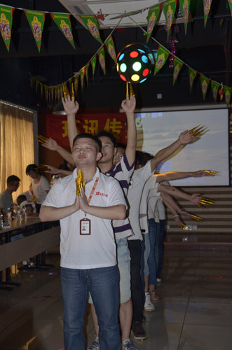 此次才藝比拼,共有21個(gè)節(jié)目。在前期準(zhǔn)備中,陳總將員工按部門分成7個(gè)組,所以,此次的才藝比拼,也是這7個(gè)組的終極PK。節(jié)目內(nèi)容也是豐富多樣,有熱辣的最炫民族風(fēng)、椅子舞,有爆笑的小品《傻子上學(xué)》,有搞怪的《千手觀音》、《甩蔥舞》,有溫馨感人的《感恩的心》等等。
