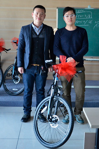 4月14日上午,在環(huán)訊傳媒全體員工的見證下,董事長(zhǎng)陳總獎(jiǎng)出了第三輛美利達(dá)自行車?,F(xiàn)在該自行車的主人是商務(wù)部的員工——舒昶赟。他以達(dá)到目標(biāo)金額成功簽定微網(wǎng)站的成績(jī),獲得了這一獎(jiǎng)品。