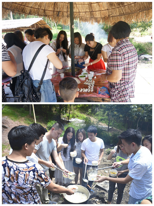 欣賞完美景,大家來(lái)到燒烤區(qū)內(nèi),動(dòng)手制作豐盛的午餐。女孩子們忙活開了,紛紛自發(fā)的洗菜、切菜,準(zhǔn)備接下來(lái)的重頭戲——包餃子。不一會(huì)兒,在女孩子們的巧手之下,各式各樣的餃子誕生了,燒好一大鍋的水,餃子在鍋里翻滾著,光是看著就讓人垂涎三尺。