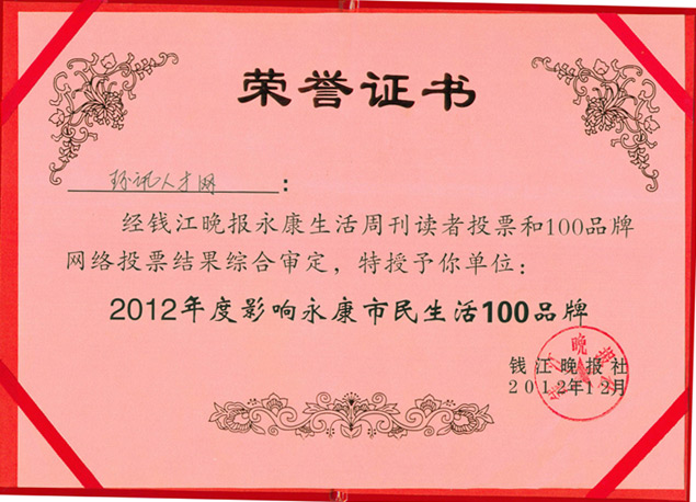 環(huán)訊人才網(wǎng)榮獲影響永康市民生活100品牌