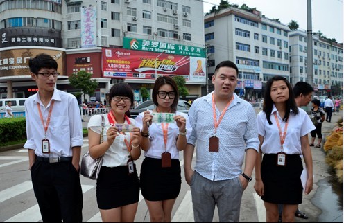 隨后,五人分頭展開行動,去向過往路人收集號碼。過了不久,筆者看到小王拿著錢,興奮地跑過來:“報告經(jīng)理,我的蘋果賣出去了,賣了20元。”